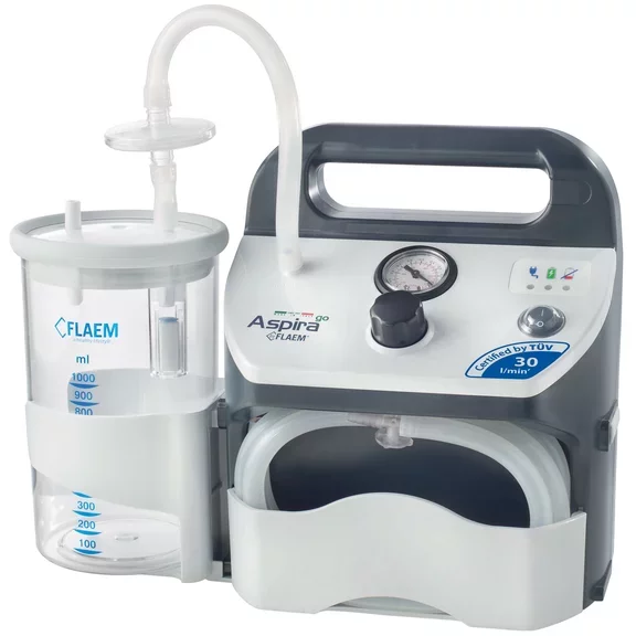 ASPIRA Go is an aspirator designed for medical and surgical use in healthcare centres such as hospitals and for home care for pharyngeal suction and during transportation. It generates suction (aspiration) which allows fluids to be extracted through single use tubing connected to a collection canister which retains the fluids until they can be properly disposed of.
